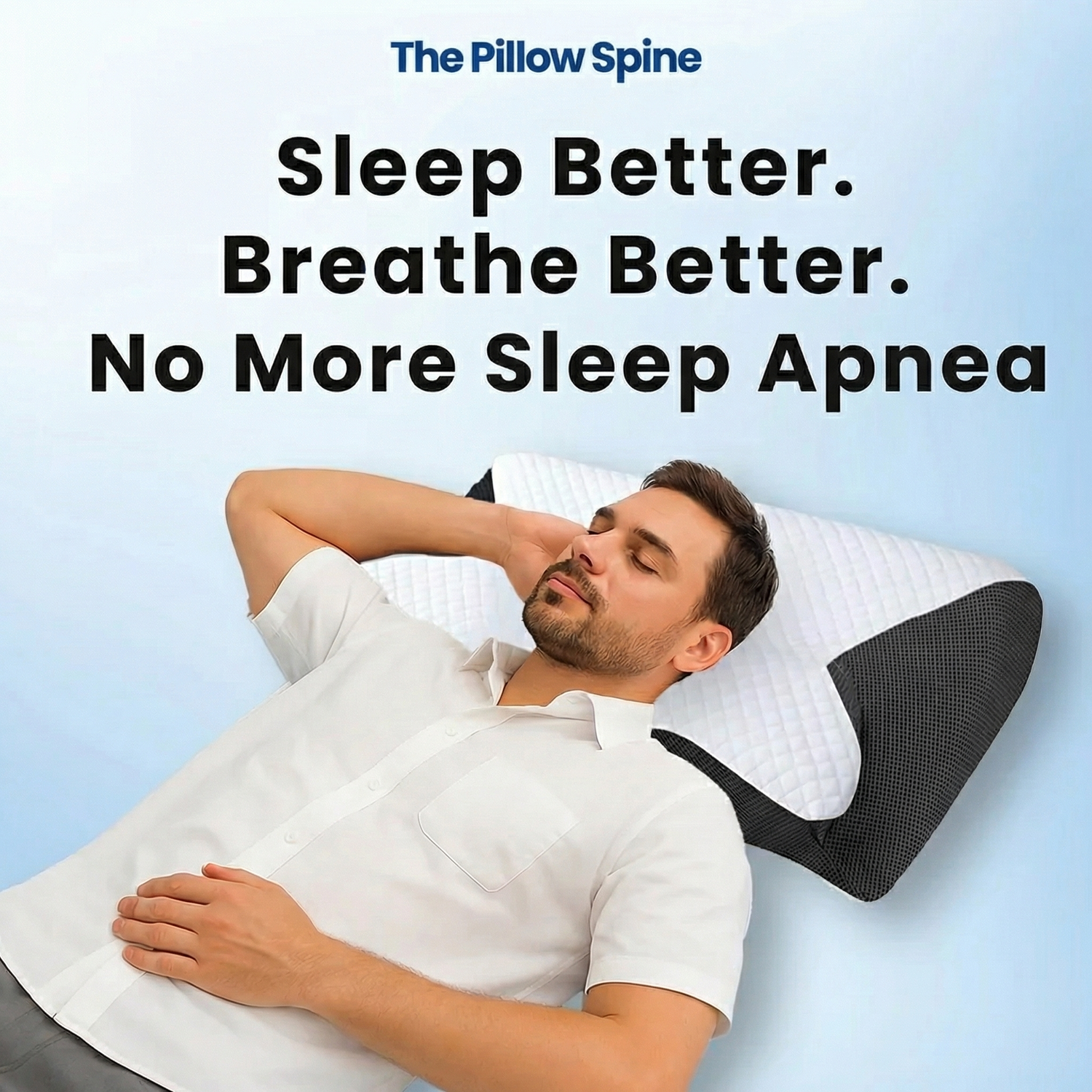 The Pillow Spine keeps your head and neck in perfect cervical alignment all night long — naturally holding your airway open so you breathe freely, sleep deeply, and wake up feeling like a completely different person.