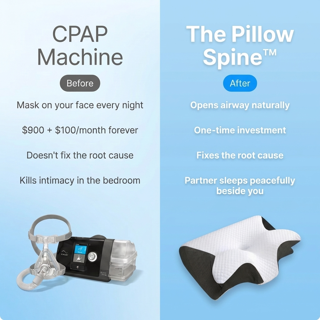 The Pillow Spine keeps your cervical spine in perfect alignment all night — naturally holding your airway open so you breathe freely. Same result as a $900 CPAP machine. No mask. No noise. No monthly cost.