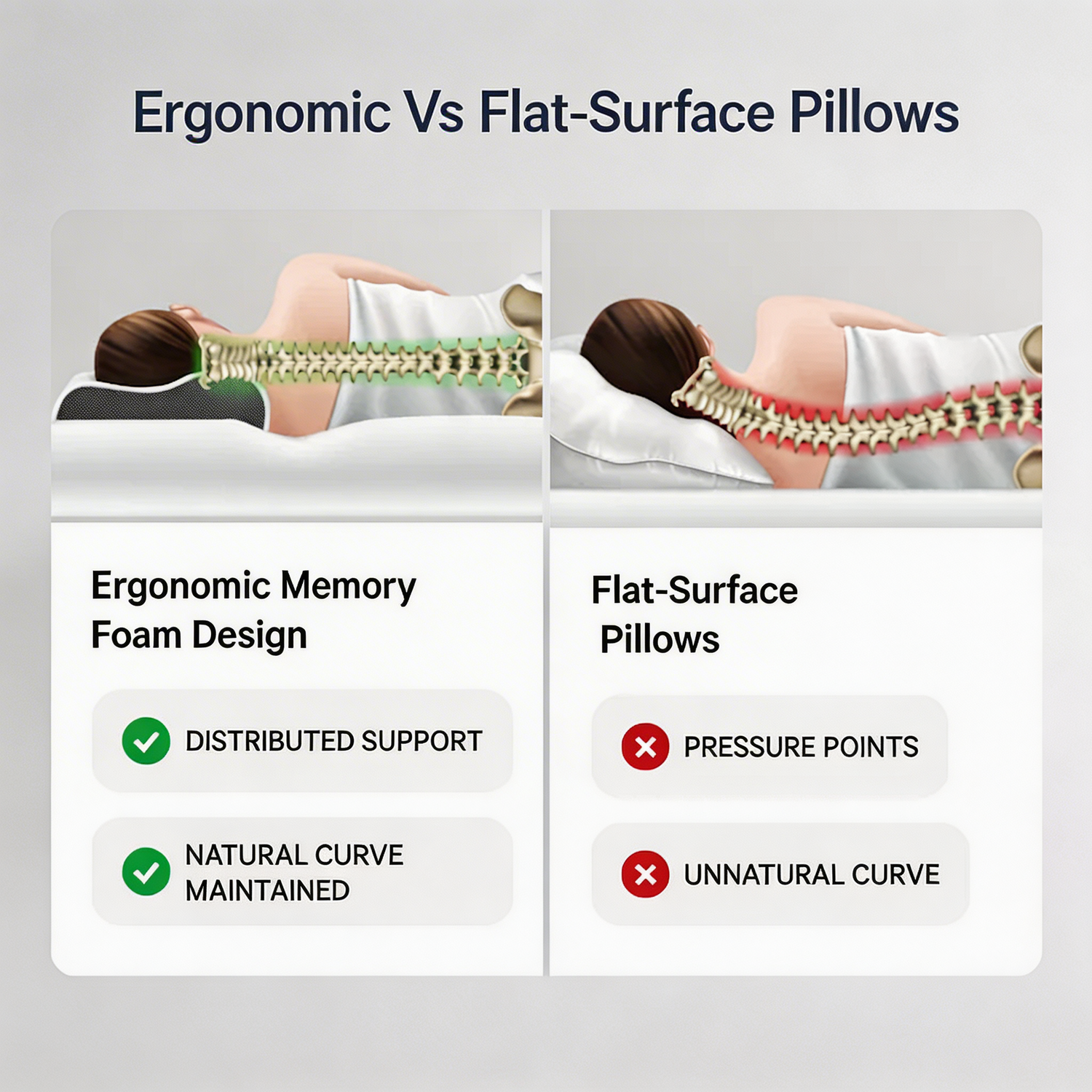 The Pillow Spine Curve cradles your neck and keeps your cervical spine in perfect alignment from the moment you close your eyes to the moment you wake up. No more snorring. No tension. No compensation. No pain. Just your body finally resting the way it was designed to.